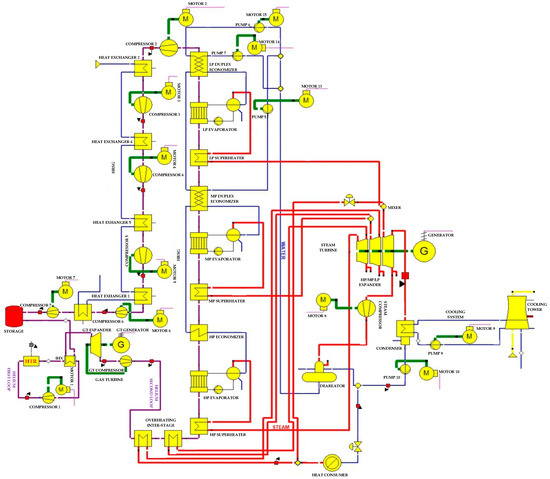The calculations were made by using software provided by Steag Energy Services—Ebsilon Professional. A mathematical model for the key components of a high-temperature nuclear reactor coupled with the advanced gas turbine combined cycle is presented in Table 3 and Table 4 [37,38,39,40,41].