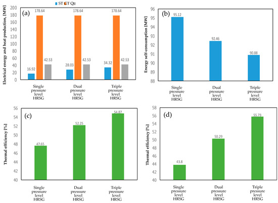 Electrical energy from GT, ST and heat production Q (a), energy self-consumption (b) and overall system thermal efficiency for the system with 1P, 2P, and 3P HRSG without (c) and with (d) inter-stage steam overheating.
