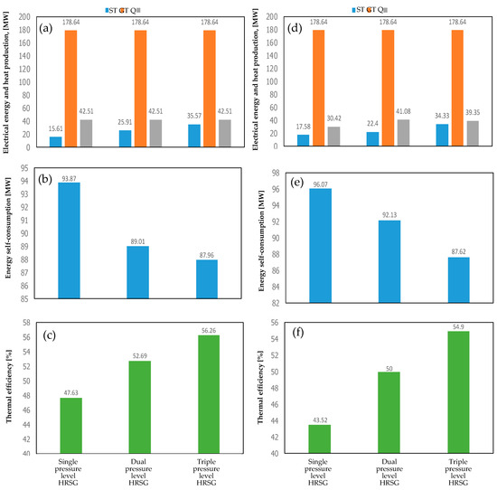 Electrical energy generation from GT, ST and heat production Q (a,d), energy self-consumption, (b,e) and the overall system thermal efficiency (c,d) for the system with 1P, 2P, and 3P HRSG with a steam regeneration system (a–c) and with inter-stage superheating and regeneration of steam (d–f).
