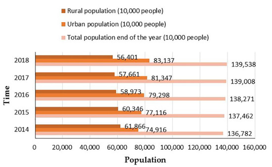 According to the statistics of the National Bureau of Statistics of China, as seen in Figure 1, the total population of the mainland increased from 1367.82 million to 1395.38 million during the five years from 2014 to 2018. From the perspective of urban and rural structures, the resident population of urban areas has increased from 749.16 million to 831.37 million. The proportion of the urban population to the total population (urbanization rate) increased from 54.77% to 59.58% [1], indicating that it is in the middle and late stages of urbanization. The urbanization process has led to a sharp increase in urban density and the scale of cities in China. Many environmental problems have become increasingly prominent. The increasingly rough urban underlying surface and highly concentrated anthropogenic heat emissions together form a special urban climate environment, mainly manifested as weak urban winds, the heat island effect, and impeded urban air circulation and pollutant diffusion [2]. Unreasonable architectural layouts or architectural forms create an outdoor static wind zone, which is not conducive to the spread of pollutants and exhaust gases during the spring and autumn, and which is also not conducive to heat dissipation in the summer. These problems have promoted the public’s vision of the wind environment in urban space [3].
