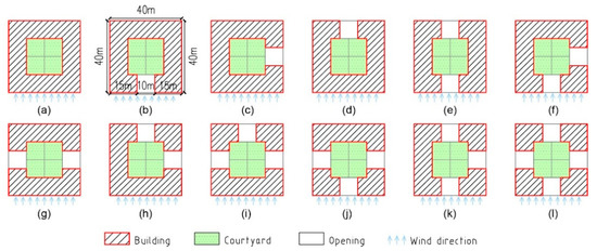 There are plenty of studies on wind motion through urban buildings [7]. Guo et al. [8] investigated the urban ventilation path, scattered morphology, and green space system that have a remarkable effect on promoting ventilation and alleviating the urban heat island effect. Enclosed city blocks are extremely unfavorable to ventilation. Kuo et al. explored the pedestrian-level wind flow characteristics inside the street canyon. The variables included the street canyon width, approaching wind direction, and podium height [9]. Guo et al. [10] used the art gallery as a case, and suggested that with comprehensive consideration given to elevation aesthetics and plane functions, one could create certain forms at suitable positions of a building to deflect wind and direct it through wind tunnels by distributing building volumes and creating open-up spaces and openings, so as to facilitate natural ventilation. Sharples et al. [11] carried out a wind tunnel study investigating the airflow through courtyard and atrium building models. The results from the study suggested that the small scale open courtyard in an urban environment had poor ventilation performance. Abdulbasit et al. [6] combined experimental and simulation methods in their research. The result verified that the manipulation of the courtyard configuration and its orientation impacted its microclimate modifying ability. Liu and Huang found that based on the computational fluid dynamics (CFD) calculation and simulation results, the growth of the height of the patio has exerted the prime influence on the natural ventilation performance of the “Yinzi” dwellings, which were enclosed buildings [12]. Jin et al., focusing on severe cold regions, studied the relationships between the mean wind velocity ratio at the pedestrian level and the residential areas’ building densities and high-rise buildings’ layouts [13]. Xu et al. studied the traditional courtyards in southern Jiangsu Province. They proposed three strategies, including adjusting the courtyard layout, modifying the aspect ratio, and building an ecological buffer space to maximize its benefits of regulating the microclimate in winter and summer [14]. Ying et al. [15] analyzed the wind environment around a group of six square high-rise buildings. The research models in this study were six homogeneous cube models. Their study in 2019 [16] simulated the wind environment of 12 typical single-enclosed building opening schemes, as is shown in Figure 2 [16]. This research provided new ideas for the study of the outdoor wind environment of a single enclosed multi-story building. Overall, several investigations carried out simulations of the wind in enclosed buildings such as large-scale urban blocks, actual architecture cases, and homogeneous or single-volume models. There is no quantitative research on the outdoor wind environment of enclosed multi-story building groups in complex urban environments, which should be of great concern.