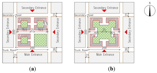 According to the possibility of architect design and the requirements of building fire protection [17], this paper divided the layout of the enclosed office building group into the following two types, as seen in Figure 3: multi-yard type and overall courtyard type, including the multi-yard parallel opening (M-p), the multi-yard returning shape opening (M-r), the overall courtyard parallel opening (O-p), and the overall courtyard returning shape opening (O-r), as is shown in Figure 4. The ideal site model was set to 200 m × 200 m (length, width). The south side was the main road with a width of 28 m where the main entrance to the site was set up. The roads on the east, west, and north sides were secondary roads with widths of 21 m, and which had secondary entrances. The building group size was 79.5 m × 79.5 m × 24 m. The building was 8 m away from the road red line, the distance between the groups was 25 m, the width of the enclosed office building group was 15 m, the green space rate was not less than 30%, the building density was not more than 40%, the plot ratio was not more than 2.2, and the room depth was 18.4 m. These indicator parameters were selected according to Hangzhou City Planning Management Technical Regulations by the Hangzhou Planning Bureau [19]. The technical specifications of the four layouts shown in Table 3 met the above requirements.