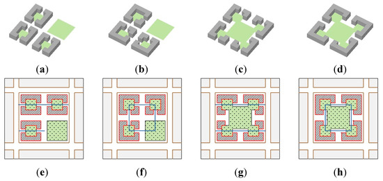 Four typical multi-enclosed office building group layouts. (a) M-p model; (b) M-r model; (c) O-p model; (d) O-r model; (e) M-p floor plan; (f) M-r floor plan; (g) O-p floor plan; (h) O-r floor plan.