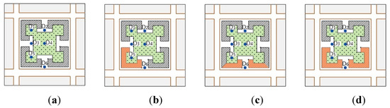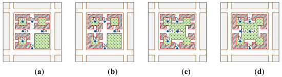 Distribution of the overhead measuring points. (a) Overhead ratio = 0; (b) Overhead ratio = 25% (one side); (c) Overhead ratio = 25% (middle); (d) Overhead ratio = 50%, the orange part represents the overhead position.