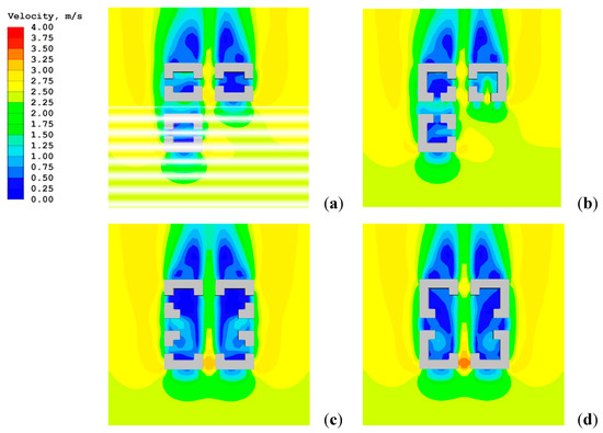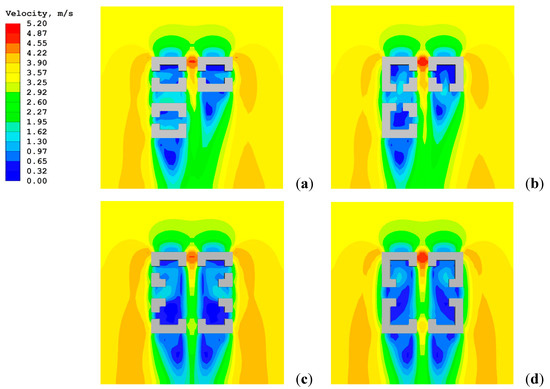 Summer simulation results of four layouts. (a) Summer wind simulation results of the M-p scheme; (b) Summer wind simulation results of the M-r scheme; (c) Summer wind simulation results of the O-p scheme; (d) Summer wind simulation results of the O-p scheme.