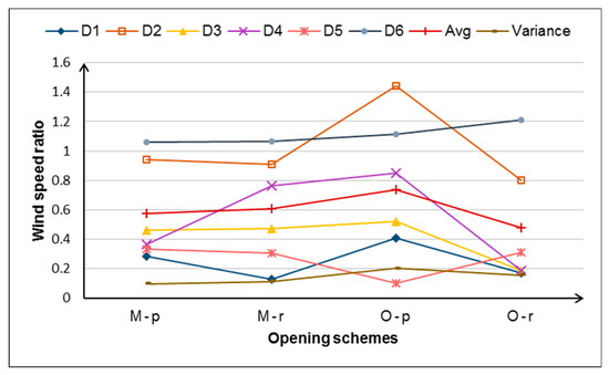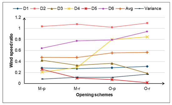 Similar to summer monsoon simulation results, the wind speed of the measuring points on the axis parallel to the inflow wind direction was relatively large in the four layout schemes. The actual wind speed exceeded 3 m/s in many places, so winter shelter measures should be considered. Among the four layout forms, the variance of measuring points of the O-r type was the largest, which was 0.17, and the wind speed ratio varied from 0.02 to 1.10. The variance of measuring points of the M-p type was the smallest, which was 0.08, and the wind speed ratio varied from 0.21 to 1.04. This indicates that the natural ventilation performance of each area of the O-r layout was very different, and the natural ventilation performance of the M-p layout was relatively uniform, and the wind speed ratio was closest to the comfort range (0.5–0.93), as is shown in Figure 11.