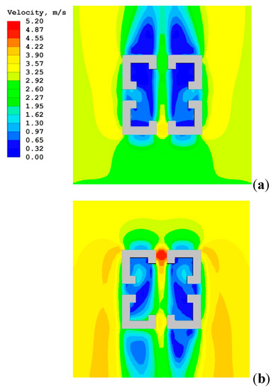 Simulation results with overhead layers using the overhead ratio of 25% on one side as an example. (a) Summer wind simulation result with overhead layers; (b) Winter wind simulation result with overhead layers.