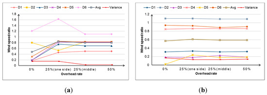 Wind velocity ratios when the overhead layers are in the inflow wind direction. (a) Wind velocity ratio of summer wind in O-r type; (b) Wind velocity ratio of winter wind in O-r type.