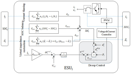 16]. Hence, in order to balance the output power of each ESU and to coordinate the battery control in different states, an effective load sharing method is needed. Specifically, a higher SOC unit should supply more power; in contrast, a lower one should supply less. In this way, SOC balancing can be achieved [