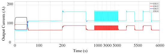 Figure 6, the output currents of ESU 1 and 2 change from 53.56 to 80.56 A, and ESU 3 and 4 change from 106.74 to 160.16 A. Therefore, the proportional current sharing can be achieved, and the simulation results correspond to the current sharing ratio