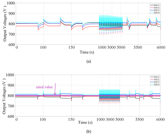 Figure 7b. At 3000 s, the output voltages are 785.4, 792.6 V, 807.9, and 815.1 V with the proposed method. Without the local voltage controller, the voltages cannot be restored to the reference value compares with