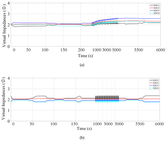 Figure 8 represents the results of virtual impedances with conventional (a) and proposed (b)controller. The simulation time is 6000 s, which is divided into three timing phases, i.e., 0–1000 s, 1000–5000 s, and 5000–6000 s.