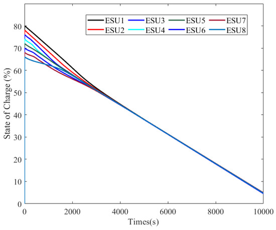 , respectively. When the simulation began, the ESUs with higher SOC gave more power, while the lower one gave less. So the difference between SOCs of every ESU gradually became smaller, and eventually trended toward balance (at about 2000 s), thereby equalizing the state of charge of each ESU. This strategy is effective in cases where the initial SOC is different.