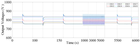 was set to 1 for each ESU. The simulation time was 6000 s, which was divided into three timing phases; i.e., 0–1000 s, 1000–5000 s, and 5000–6000 s. From the simulation results, it can be seen that SOC balancing and output current sharing can be achieved, the output voltages can be ensured to operate at the reference value, and the virtual impedances can operate stably with the proposed strategy. Hence, the effectiveness of the proposed method is proven.