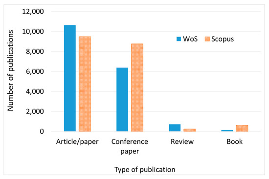 Analyzing the type of publication (Figure 1) shows that most publications are articles/papers (10,633 in WoS and 9479 in Scopus) and conference papers (6372 in WoS and 8768 in Scopus). There is a much lower number of reviews (708 in WoS and 255 in Scopus) and books (133 in WoS and 633 in Scopus). Please note that the sum of publications in all categories is higher than the total number of documents, since both databases catalog some documents as more than one type of publication.