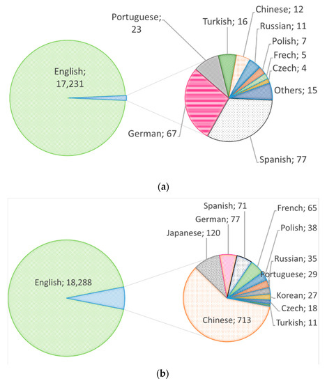 Distribution by language of documents published during the period January 2013–September 2019: (a) Web of Science; (b) Scopus.