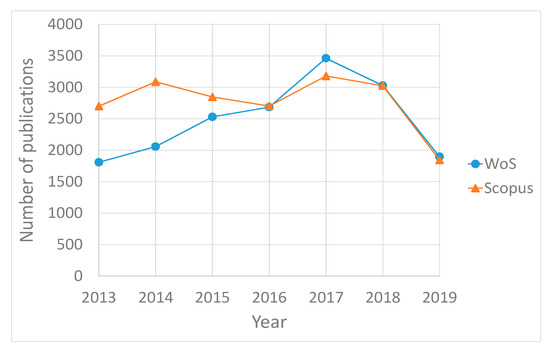 The trends in the number of publications in the period analyzed (January 2013–September 2019) are presented in Figure 3. In WoS, the number of publications increased in this time period from 1809 to 3462 (doubling the number of documents in this period) and decreased slightly in 2018 to 3028. The average number of publications per year in the period 2013–2018 was 2595. On the other hand, Scopus showed a more constant number of publications per year, with an average of 2922 publications/year in the studied time period.