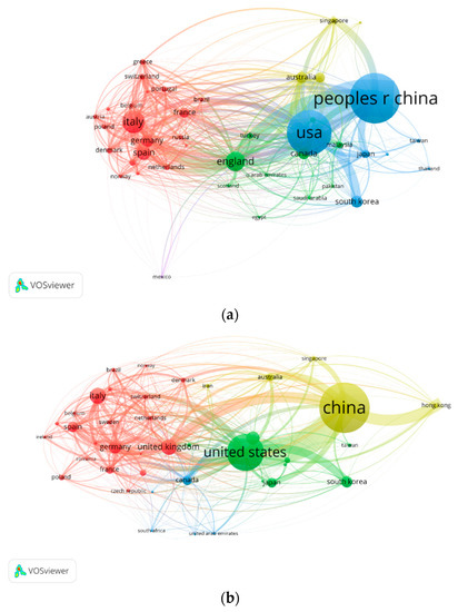 Network of countries with the highest number of documents in the topic of study during the period January 2013–September 2019: (a) Web of Science; (b) Scopus.