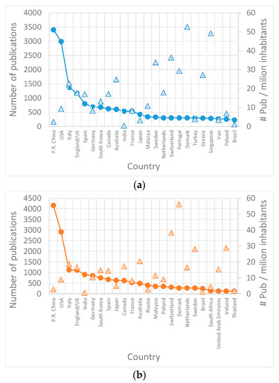 Scientific production per country (continuous line) during the period January 2013–September 2019 and number of publications per million inhabitants (single marker): (a) Web of Science; (b) Scopus.