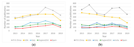 Trends in the number of publications in the area of study for the five countries with most publications: (a) Web of Science; (b) Scopus. Note that India ranks 10 in Web of Science, while Spain ranks 8 in Scopus.