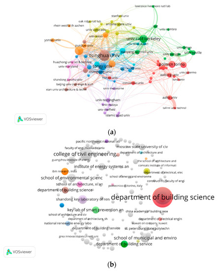 The institutional networks are very different for WoS and Scopus (Figure 8); in fact, with Scopus (Figure 8b), faculties and departments are shown, and, therefore, we do not really know the institutions working on the topic. On the other hand, WoS provides the institutions with the most documents, which are the University of California Berkeley (USA), Tsinghua University (China), Hong Kong Polytechnical University (China), and the Polytechnic University of Torino (Italy). Strong links are seen between the University of California Berkeley and Tsinghua University (confirming the strong links found between both countries before). The network also shows strong links between institutes with low number of documents, such as Aalto University (Finland) and Tallinn University of Technology (Estonia), University of Maryland and Shandong Jianzhu University, or University of Perugia (Italy) and University of Lleida (Spain).