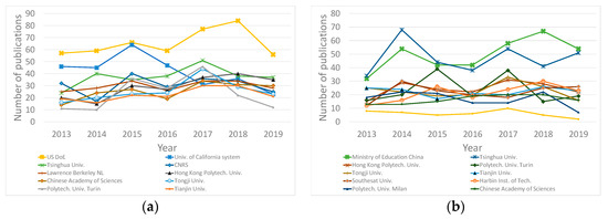 The institutes with the highest number of publications in the topic of study in the period 2013–September 2019 are shown in Figure 9. The results are quite different for the two databases used. In WoS in the first and second places, there are two US institutes: the US Department of Energy with a total of 458 publications, an average of 67 publications/year, an h-index of 39, and an ACI of 13.03; and the University of California system with a total of 292 publications, an average of 45 publications/year, an h-index of 38, and an ACI of 17.24. Moreover, the Lawrence Berkeley National Laboratory appears in 5th place, with a total of 209 publications, an average of 30 publications/year, an h-index of 34, and an ACI of 18.17. Although as a country, China is the first one, its institutes come later, but five of them are within the ten first institutes. Tsinghua University is the third institute (with a total of 263 publications, an average of 38 publications/year, an h-index of 29, and an ACI of 12.64), the Polytechnic University of Hong Kong is the sixth (with a total of 169 publications, an average of 24 publications/year, an h-index of 24, and an ACI of 12.15), the Chinese Academy of Sciences is the seventh (with a total of 179 publications, an average of 25 publications/year, an h-index of 22, and an ACI of 10.01), Tongji University is the eighth (with a total of 179 publications, an average of 26 publications/year, an h-index of 19, and an ACI of 6.91), and Tianjin University is the tenth (with a total of 159 publications, an average of 23 publications/year, an h-index of 20, and an ACI of 8.01). Moreover, the US institutes had a greater impact than those of China.