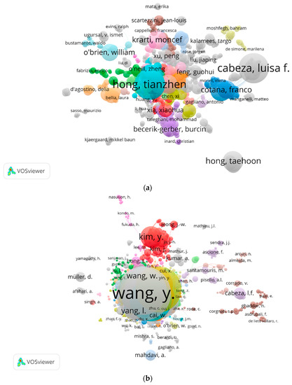 The authors with the 10 most publications are from different countries; there are two authors from South Korea, USA, China, and Italy and one author each from Spain and Australia. Regarding the collaborations between these authors (Figure 10, some of the relationships here described are not visible in Figure 10 due to the overlap of forms and names in the visualization), Luisa F. Cabeza is strongly related with Anna Laura Pisello, who shows association with John E. Taylor (Virginia Tech, USA) and Mattheos Santamouris. The latter, on the other hand, is related to Fabrizio Ascione (University of Naples Federico II, Italy), Giuseppe Peter Vanoli (University of Molise, Italy), and Burcin Becerik-Geber (University of Southern California, USA). Another group of related authors is that of Tianzhen Hong, Da Yan, Stefano P. Corgnati, and William O’Brien (Carleton University, Canada). Finally, Shengwei Wang shows a small association with other Chinese authors.