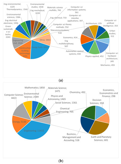 Scopus (Figure 11b) has much fewer but broader categories. The first one is Engineering (59% documents), followed by Energy (27%) and Computer Science (22%). As in WoS, all other areas correspond to less than 20% of the publications.