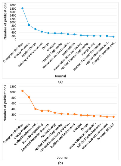 Figure 12 shows the top 15 journals with the most publications in the field of study in the period January 2013–September 2019 for both databases. The most popular journal by far is “Energy and Buildings” in both databases. Moreover, most of the journals fall within the field of energy and engineering. When analyzing the journals in detail (Table 2), the journals devoted to conference proceedings (i.e., Applied Mechanics and Materials, Energy Procedia, IOP Conference Series, and Procedia Engineering) are the ones with the lower impact or even without impact factor, hosting authors with h-indexes between 12 and 21. On the other hand, most journals belong in the first quartile (Q1), with only two belonging to the second quartile (Q2), in the field of Energy and Sustainability. These two journals are fully open access. The journals with the highest impact are Renewable and Sustainable Energy Reviews and Energy Policy, with h-indexes of 147 and 80, respectively. The most popular journal is third in impact, Energy and Buildings, with an h-index of 70 in the period of study (2013–September 2019).