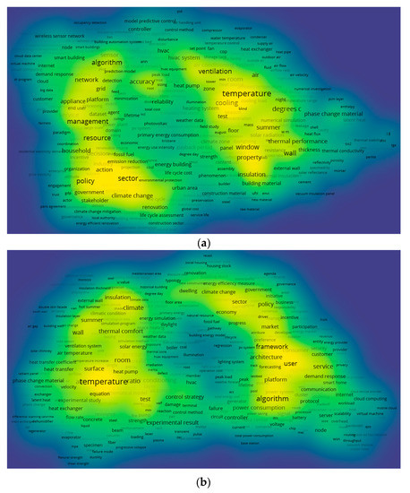 Figure 14 shows details of the co-occurrence map, where the red cluster includes terms such as “climate change,” “building sector,” “policy,” and “resource”; in this cluster, there is no relation with technologies. In the second cluster, (green) terms such as “temperature,” “cooling,” “thermal comfort,” and “ventilation” appear, indicating a relationship between cooling and technologies (Figure 14a), and ventilation and technologies (Figure 14b). On the other hand, “heating” is not a keyword in this co-occurrence map. The blue cluster groups more terms with technologies, not only hard technologies such as “HVAC” or “HVAC system” (Figure 14c), but also soft terms such as “algorithm” appear (Figure 14d). The yellow cluster includes terms related to new building materials or materials to change the envelope behavior, such as “phase change material” (Figure 14e). Finally, the purple cluster includes technologies used in buildings for heating and cooling, such as “solar energy,” “geothermal energy,” and “heat pump” (Figure 14e). Nevertheless, renewables are not as prominent as might be expected.