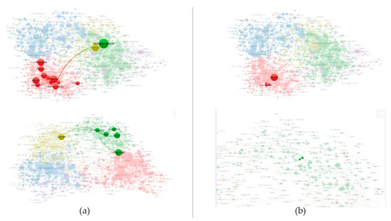 Detail of the co-occurrence of keywords (left: Web of Science, and right: Scopus): (a) links of the term “climate change”; (b) links of the terms “greenhouse gas”, “greenhouse gases”, and “greenhouse gas emissions”.