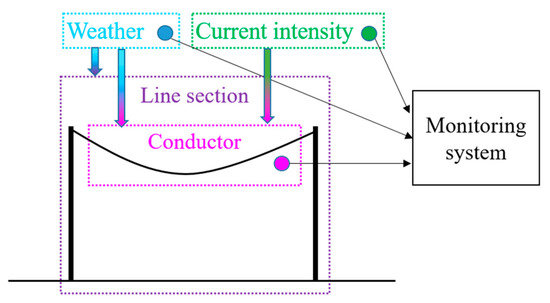The conductor tension and temperature measured by a monitoring system in a line section depends on several factors (Figure 1). Obviously, the characteristics of the line section are the most determinant factors. The conductor characteristics such as the weight, the modulus of elasticity and the coefficient of thermal expansion affect the sag–tension performance. The span length and the number of suspension towers between the two tension dead-ends also affect the sag–tension performance. Apart from the physical configuration of the line, other factors affect the measured performance. The weather conditions during the measurement period affect the measured tension values because of the overload due to the wind, the rain and the ice. Finally, the uncertainties of the measurement systems influence the measured performance.