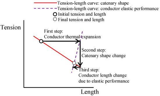 Thermal expansion is the result of a temperature change of the conductor. This temperature change is due to current intensity or weather magnitude changes. The thermal expansion process is shown in Figure 2. The first result is a change of the conductor length (first step). The consequence of the conductor length change is a change in the catenary shape that results in a tension change (second step). The tension change affects the conductor length because of the elastic performance of the conductor (third step). The elastic performance counteracts the thermal expansion length change. For example, when the temperature increases, the conductor length increases (first step), the tension decreases (second step) and the conductor length decreases (third step), reducing the initial conductor length increase. As a result of the conductor length change (first step), a change in the catenary shape occurs that results in a tension change (second step), that results in a conductor length change (third step), that results in a catenary shape change (second step), etc.; in other words, the second and third steps influence each other until some final tension and length values are obtained, where neither more conductor length change nor catenary shape change occurs.