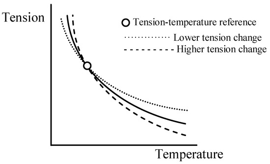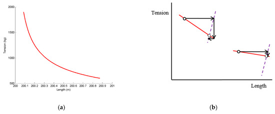 The relation between the tension and the length of the catenary is not linear (Figure 3a). For a certain length change, the tension change is higher for high tension values. As a consequence, the same temperature change results in a lower tension decrease at lower tension values (Figure 3b). In Figure 2 and Figure 3b, the tension–length curve of the catenary is linearized around the initial tension–length value in order to simplify the explanation of the process.