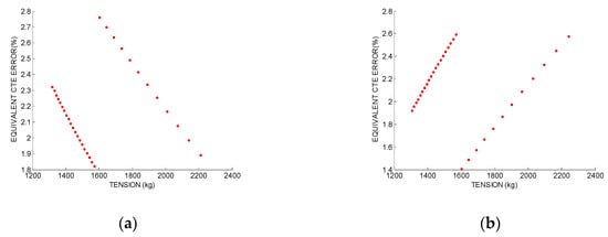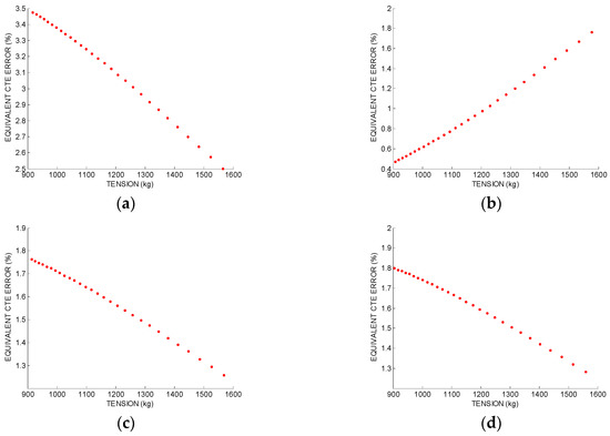 In Figure 5a, the equivalent CTE error for a 2% error in the weight is shown. The tension range corresponds to the tension values between −5 °C and 80 °C when the conductor is installed at the 15% of the Rated Breaking Strength at 15 °C. Therefore, the average CTE equivalent error is 3.1%. If the weight error is 0.2%, the average CTE equivalent error is 0.3%.