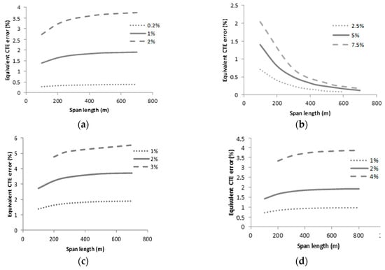 In the case of the span length error, the effect is double. On the one hand, a certain span length deviation, for example 1 m, has a lower relative value for a long span. For example, it is a 1% error for a 100 m span but a 0.5% error for a 200 m span. On the other hand, the same percentage error results in a different equivalent CTE error depending on the span length (Figure 7c). However, the influence of the span length is low.