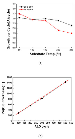 The thickness of the deposited thin films was then analyzed based on SEM images, to verify whether the ALD process had been successfully implemented. In the ALD process, a film is deposited by the self-limiting surface reaction of gas molecules on the substrate surface. Thus, sufficient source exposure time is essential to enable the gas molecules to be uniformly deposited on the substrate as reaction sources. After this sufficient amount of time, the growth rate of thin films starts to saturate. Additionally, at low-temperatures, the deposition rate of thin films remains constant. This temperature window is where the ALD process takes place, i.e., 50–200 °C for ZnO and 90–130 °C for ZnS. These temperatures are highly suitable for process applications because only surface reactions occur in those ranges. As can be seen in Figure 1, the thin-film thickness linearly increases with the increasing number of ALD cycles, and this implies that the ZnO thin films were successfully deposited on the substrate in the temperature ranges mentioned above [4,8,9].