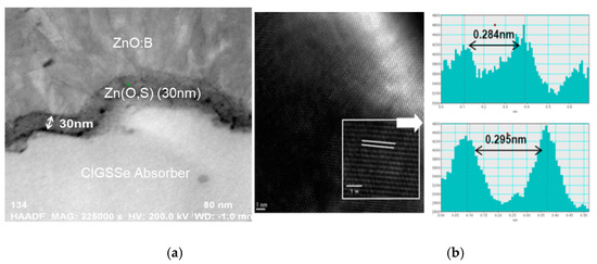 Cross-sectional TEM images of a CIGSSe solar cell with ALD grown Zn(O,S) buffer layer. (a) Magnified TEM image of the ZnO:B/Zn(O,S)/CIGS (b) image of grains lattice spacing