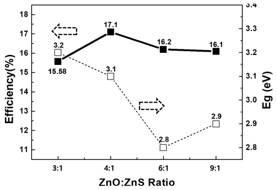 The energy bandgap and photo-conversion efficiency of the CIGSSe solar cells were measured and analyzed with respect to the Zn(O,S) ratio, as shown in Figure 3. The composition, structure and optical properties of the Zn(O,S) films were determined using samples deposited with 100 cycles on SLG. The total S/Zn ratio in the Zn(O,S) films as a function of the H2S/DEZn pulse ratio is shown in Table 1. About S/Zn, we checked sulfur and zinc according to the Zn(O,S) ratio by XPS measuring equipment and also checked the efficiency difference. The sulfur concentration in the films was higher than the fraction of H2S-containing cycles in the process. For example, the Zn(O,S) 20% process produced a S/Zn ratio of 0.7. One possible explanation for the higher sulfur concentration is that the precursors reacted with the previously deposited film during a pulse. For example, H2S may adsorb on the surface and consume oxygen in the film by an exchange reaction where water is desorbed as a reaction product. In the case of H2S/(H2S+H2O), it explains the ratio that includes H2S from all the reactance gas. Additionally, we calculated the bandgap energy after measuring transmittance.