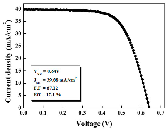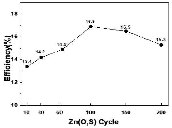 The application of the ALD method in the deposition of a Zn(O,S) thin-film reduces the occurrence of defects inside the film because the film is formed monolayer by monolayer, and thus, electrons generated by the photovoltaic reaction are less likely to be trapped (or captured) when passing through the buffer layers. Figure 4 shows how the efficiency of the CIGSSe solar cells changed according to the thickness of the Zn(O,S). When the number of cycles was 100, and the thickness was about 29 nm, the efficiency was determined to be 16.9%, and the efficiency started to gradually decrease, exceeding the thickness threshold. As such, the application of the ALD method for Zn(O,S) deposition makes it possible to precisely control the thin-film thickness by pulse/purge time and vaporization control [14,15].