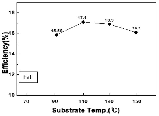 As mentioned above in Figure 1, the ALD process is characterized by a specific temperature range called the ALD window. In the present study, it was found that when Zn(O,S) thin films were formed at a constant thin-film deposition rate of 2.9 Å/cycle within the substrate temperature range of 110–130 °C through self-limiting surface reactions, the efficiency was also determined to be at similar levels, e.g., 17.1% and 16.9% as shown in Figure 5.
