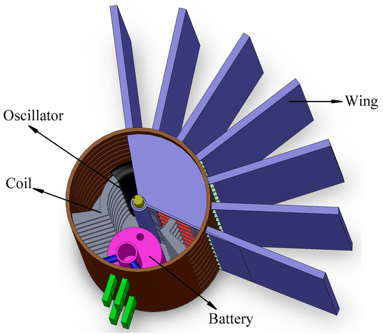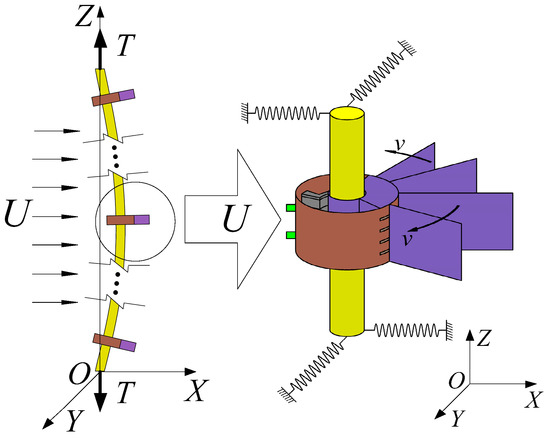 Different damping forces of various magnitudes arise from the surface action of the riser and the wing-plate relative to sea water. Therefore, the vibrations of both riser and wing plate are not synchronous, and various angular differences lead to a relative movement between the coil fixed on the wing pendulum and the permanent magnet fixed on the shell, thereby generating a current with the cutting of magnetic inductance lines (Figure 2). The vibration of the wing depends on the vibration of the riser, and hence the fraction of the VIV of the riser available to obtain energy equals the upper limit of the energy captured by the power generation device. On the one hand, studying the power generation efficiency of the riser vibrator enables an upper limit of the energy-capture efficiency of the power generation device to be estimated; on the other hand, the weight and size specifications of the wing plate of the power generation device can be estimated by choosing both mass and damping ratios.
