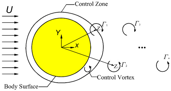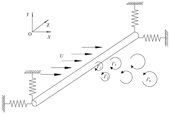 Referring to, Compared with the spacing of the generator on the riser (Figure 2), its own radial dimension is smaller in order, and hence the influence of the wing-plate motion attitude on the riser VIV is ignored; it is only added to the vibration equation as an additional damping. Depending on the existing wake vortex form [24,25], the wake region from the VIV of the rigid cylinder after discretization is assumed to be two sets of point vortices of equal strength and opposite direction. The model diagram of the discrete vortices is given in Figure 3, the diameter of the discrete unit vibrator is 0.1 m, mass ratio , damping ratio .