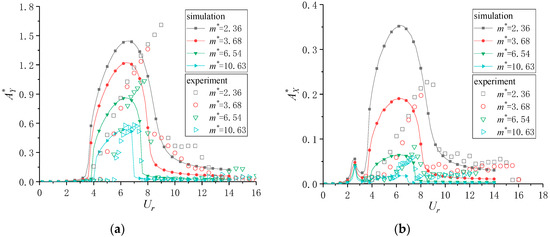 As a fluid–solid coupling variable, the dimensionless amplitude cannot be obtained directly. Because the mass ratio for a marine environment is relatively low, the dimensionless amplitude of the riser’s vibrator under low-mass-ratio conditions is analyzed first. The experimental parameter settings of Stappenbelt and collaborators (Table 1) [30] were inputted into the 2-DOF calculation model for a comparison of calculated results with experimental results (Figure 5).