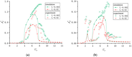 Besides the mass ratio, the damping ratio also affects the oscillation dimensionless amplitude and must be considered in the calculation of energy-capture efficiency of the vibrator. The first two groups of parameters in the low-mass-ratio experiment of the group in Michigan [20,30] were selected for verification, and the parameter settings were imported into the 2-DOF calculation model to calculate the dimensionless amplitude of the vibrator in the flow and transverse directions. Comparisons between calculation and experimental results were performed (Figure 6); a selection of calculation parameter settings is presented in Table 2.