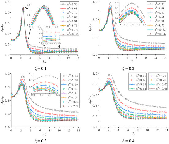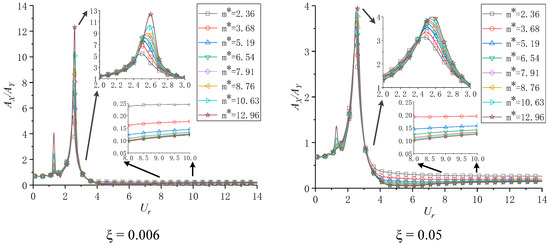 According to the flow-induced vibration experiments of a single DOF cylinder and a 2-DOF cylinder performed by Williamson and collaborators [24,25] and Stappenbelt and collaborators. Ref. [30], the vibration amplitude along the flow direction cannot be ignored. From the vortex shedding law, the downstream vibration frequency of the vibrator is always twice the transverse frequency, so the contribution of the downstream vibration to the energy absorption of the structure cannot be ignored. To assess the influence of vibration in the downstream direction, the ratio of the dimensionless amplitude in the downstream direction to that in the transverse direction is introduced and referred to as the amplitude ratio. The rate of change for the amplitude ratio under different damping ratios and different mass ratio conditions were examined (Figure 7), the parameter settings used being the same as those in the experiment described in Ref. [30].