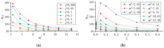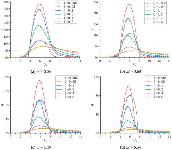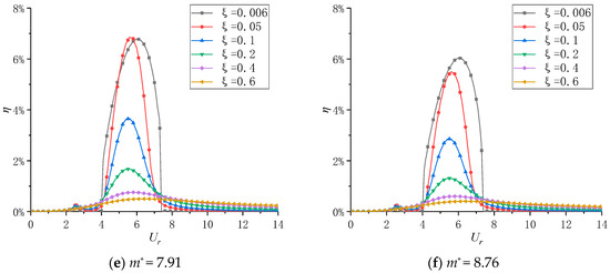 For the same damping ratio, there is an inverse correlation between the energy-capture efficiency and the mass ratio, but the sensitivity of the efficiency on the mass ratio is different for different damping ratios. As in Equation (9), the energy-capture efficiency is directly affected by the dimensionless amplitude and damping ratio. Generally, an increase in the damping ratio will cause a decrease in the amplitude ratio, which will lead to a decrease in the peak energy-capture efficiency. However, if the damping ratio is very small, the increase in the dimensionless amplitude due to the reduction of the damping ratio is much smaller than the reduction of the damping ratio itself, so the peak energy-capture efficiency will decrease. In addition, under larger or smaller damping ratios, the sensitivity of energy-capture efficiency to mass ratio is not high. When = 0.05, reducing the mass ratio from 8.76 to 2.36 leads to a peak energy-harvesting efficiency improvement of 32.95%; when ξ = 0.006 and ξ = 0.6, the peak energy-harvesting efficiency is increased by 6.08% and 7.39%, respectively (Figure 9a). This is the result of the superposition of the decrease caused by the damping ratio and the increase caused by the decrease in mass ratio. Therefore, for an appropriate damping ratio, choosing a lower mass ratio may improve the riser power generation efficiency significantly.