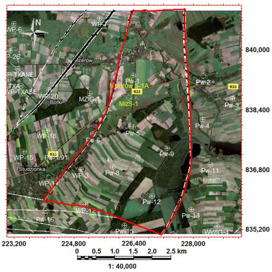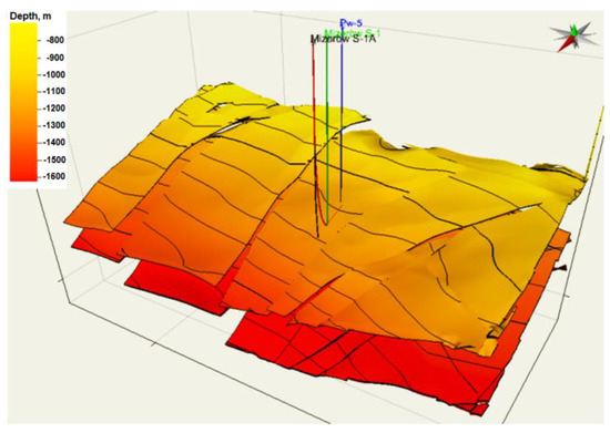 For subsequent modeling analyses, a region situated in a tectonic block of 13 km2 was selected. Figure 3 demonstrates the contour of the modeled area along with the distribution of the boreholes, which provided data for the development of the static model. The thickness of the area ranges from 209 to 521 m. A horizontal resolution of the interpolation of 50 m × 50 m was applied. The depth range in the model is from elevation 840 m ASL (depth of approximately 1100 m) to 2021 m ASL (depth of approximately 2275 m).