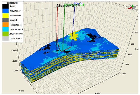 During the course of developing the lithology model for Pawłowice–Mizerów region, a sequential indicator algorithm (sequential indicator simulation), belonging to the group of stochastic algorithms, was used. The application of this particular methodology was determined by the quantity of data. A static model was developed including the lithology, the thickness and the methane content of the seams in the selected tectonic block with 15.88% share of bituminous coal. Table 1 and Figure 4 present the modeling results of the lithology in the discussed region.