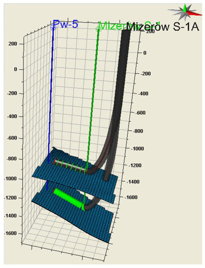 In the developed numerical model, a series of simulations associated with the injection of CO2 into coal seams 405 and 510 using the horizontal injection well Mizerów S-1A was conducted, whereas bore hole Pw-5 performed the function of a production well (see Figure 6).